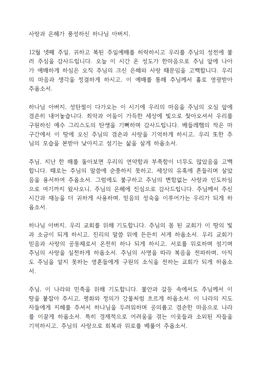 12월 넷째 주일낮예배 대표기도문 내용