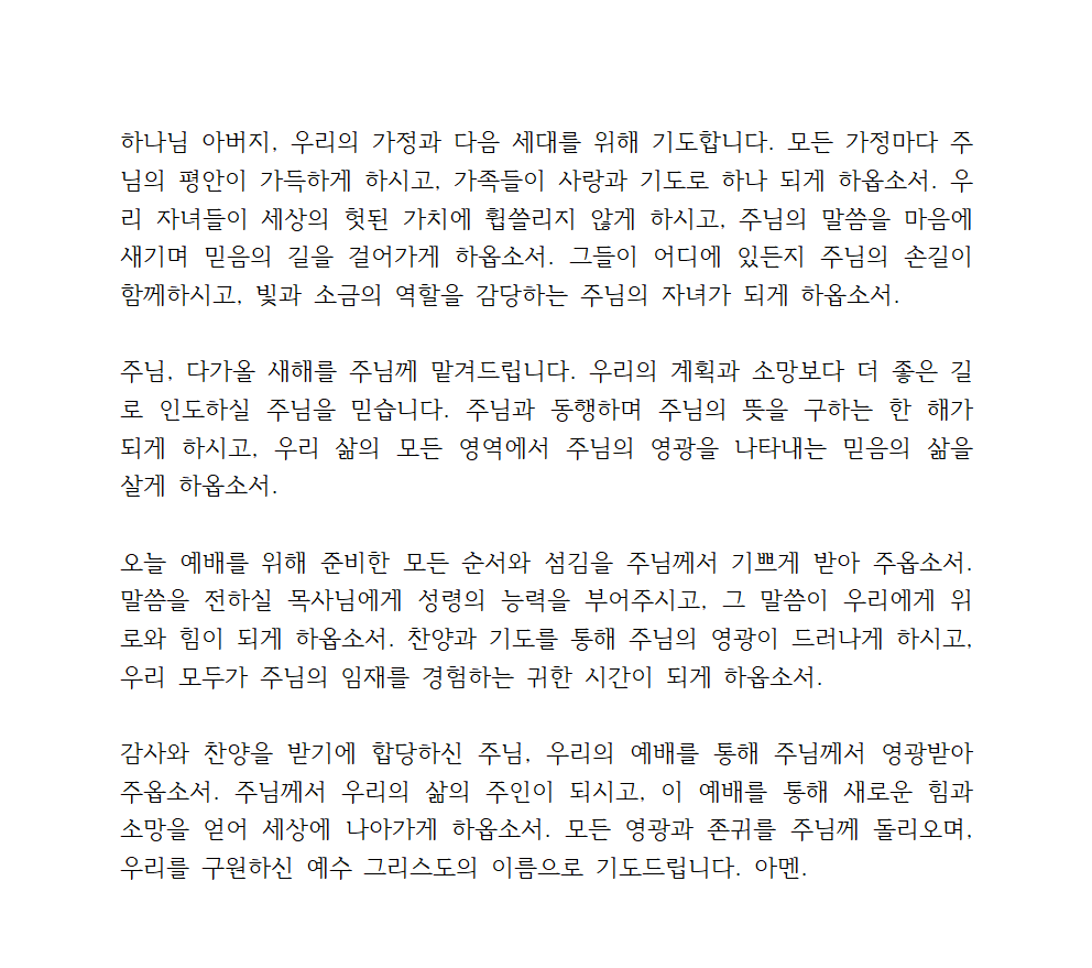 주님, 다가올 새해를 주님께 맡겨드립니다. 우리의 계획과 소망보다 더 좋은 길로 인도하실 주님을 믿습니다. 주님과 동행하며 주님의 뜻을 구하는 한 해가 되게 하시고, 우리 삶의 모든 영역에서 주님의 영광을 나타내는 믿음의 삶을 살게 하옵소서.