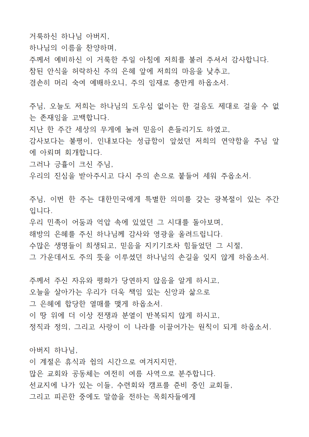 '8월 둘째주일낮예배 대표기도문'